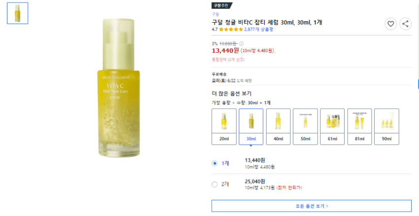 쿠팡을 자주 이용하시거나 1개만 청귤 세럼을 테스트하기 위해서 구매하실 분은 쿠팡을 이용하는 것이 좋아 보입니다.