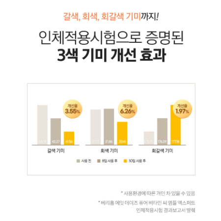 또한 3색 기미 개선 효과가 있어 갈색, 회색, 회갈색 기미까지 개선 효과가 있다고 합니다.