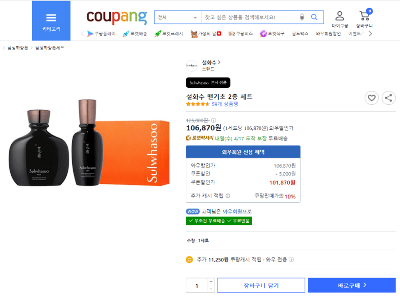 쿠팡에서 판매하는 설화수 맨 본윤 2종 세트 가격은 쿠팡회원 할인 적용으로 106,870원입니다.