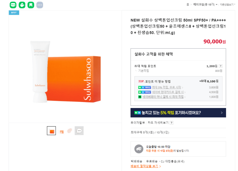 설화수 네이버 공식 스토어에서 판매 중인 상백톤업선크림 50ml 기획세트 공식 가격은 90,000원입니다.