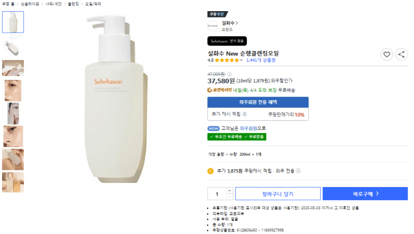 쿠팡에서 설화수 순행클렌징오일을 구매를 하게 된다면