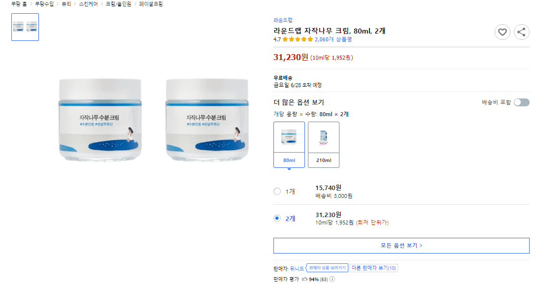 쿠팡에서 판매 중인 라운드랩 자작나무 수분크림